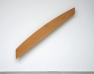 … Wood, of course, is not simply wood; the medium is not generic. Kelly has worked with birchwood, elm, mahogany, maple, oak (both red and white), padouk, redwood, sapele wood, sycamore, teak, walnut, wenge, and zebrawood. He relishes the sensual range in color and subtle traceries highlighted in certain grain patterns of the various woods he considers for sculptures. Pointing out the expressive waves and ripples in the grain of the caramel-toned blistered sapele wood of Curve XLIII (1984), Kelly commented with delight, “This always reminds me of Chinese landscape painting.”